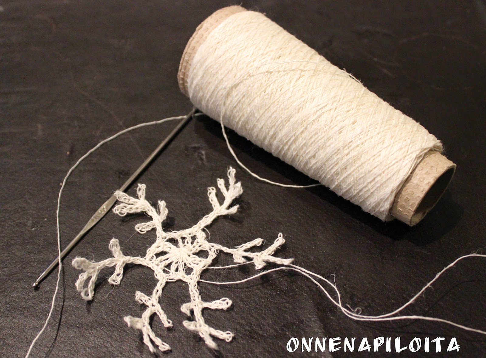 Mä olen hidas, lanka ohutta ja koukku taisi olla hivenen iso, valitsin sen toki siksi, että halusin hiutaleista ilmavia ja pitsimäisiä.