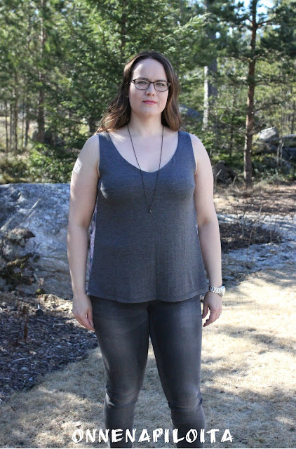 Tässä olisi vielä yksi ompelus itselleni. Kevättä on vissiin kovasti rinnassa, kun ensin tein "räikeän" värisen neulejakun ja haeti perään tämän topin, jossa on pliseerattua kukkakangasta. Onneksi kankaalla on kuitenkin harmaa pohja ja etupuoli on topissa yksivärinen, niin en täysin "hulluksi" heittäytynyt. Aika piaan varmaan käytössä näkee, kuinka tuo pliseerattu kangas kyttäytyy tällaisessa paikassa.